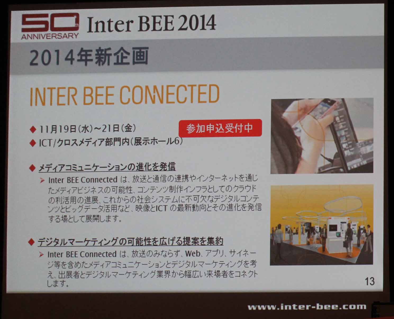Alongside "INTER BEE EXPERIENCE", a new event that will be held is "INTER BEE CONNECTED". The event's space will be prepared within the ICT/cross-media section, and the newest movements and developments in video and ICT will be presented based on themes such as cooperation between broadcasting and communications, possibilities for media businesses through the Internet, making good use of cloud computing as an infrastructure for content production, and making use of big data in content businesses. Specifically, pod exhibitions, corporate presentations, and other activities are being planned to take place in the INTER BEE CONNECTED area and at the various project sessions during the three days of the exhibition.
