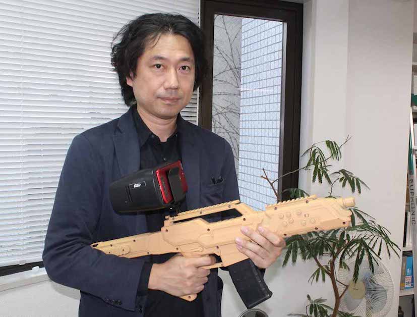 In Jurassic Island, players take an expedition by ship to a deserted island, using it as the play area to enjoy the game. (Above photograph: Mitsuru Sato, head of Euphonic’s Design and Production department, holding the gun-shaped device in his hands.)