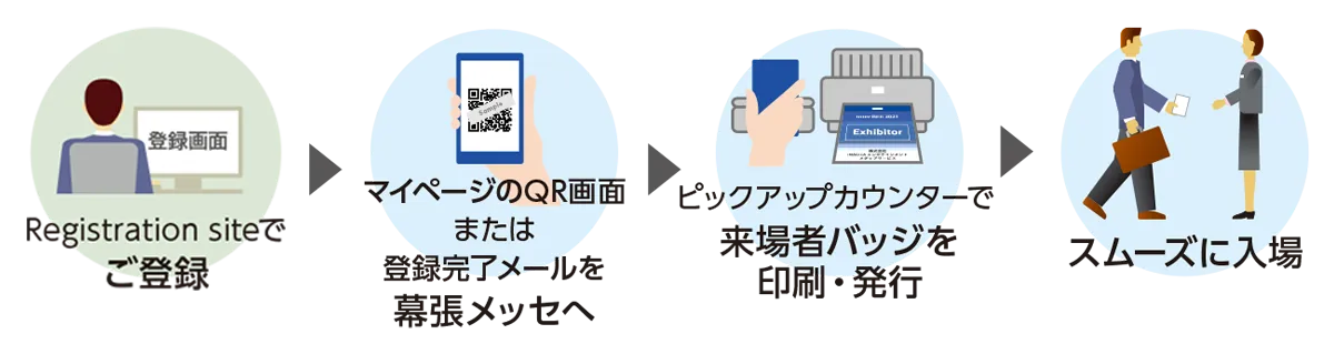 当日、来場者バッジ(入場証)を会場のピックアップカウンターにて印刷・発行いただきます。